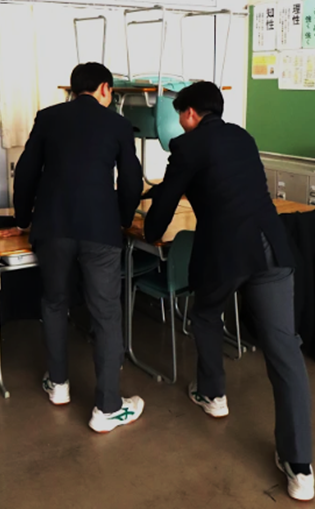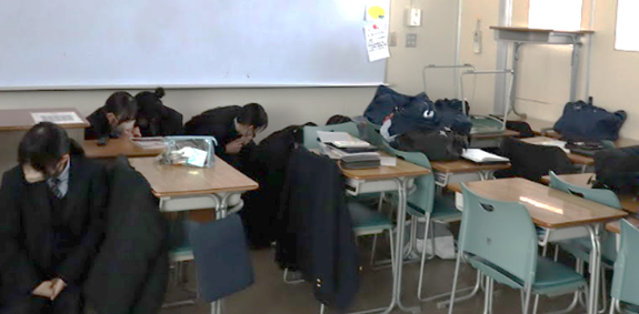 不審者の侵入を知らせる放送と同時に、生徒は教室の前後のドアを施錠しバリケードを作るなど身を守る行動を取りました。その後、中学生はスポーツセンター、高校生は体育館へ移動し、学校長の講評を真剣な表情で聞き、訓練を終了しました。