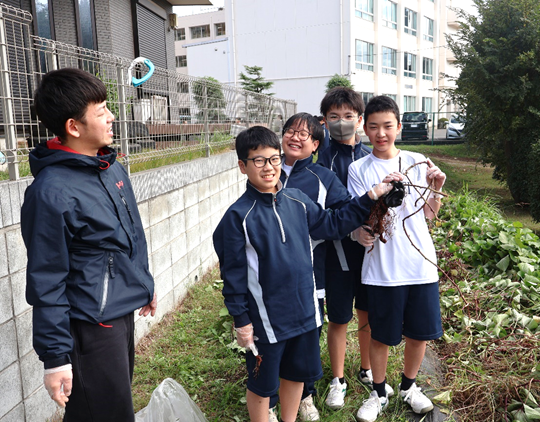 11月6日(木)、PGTプログラムの一環で中学1年が農業体験をし、春から育ててきたサツマイモを収穫しました。生徒は、自分の手で収穫したサツマイモを手にして、充実感を得ることができました。